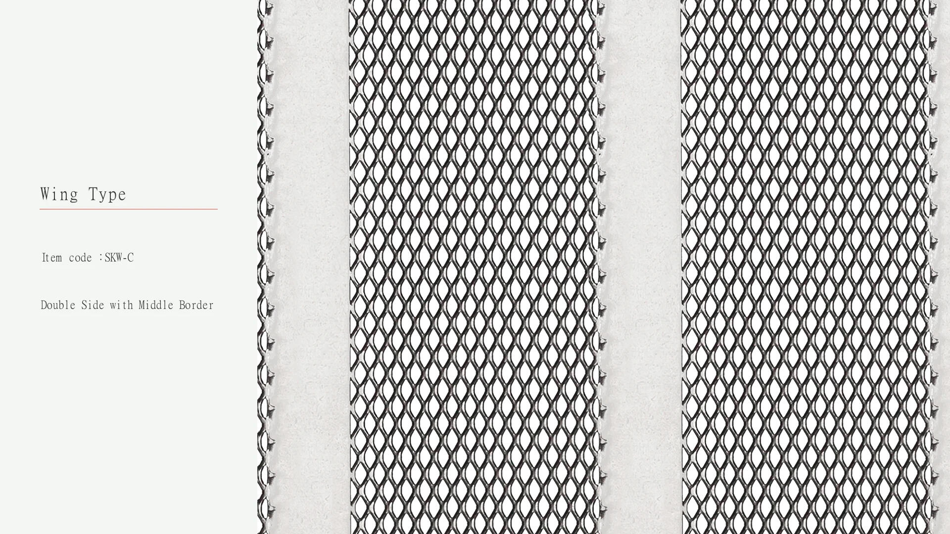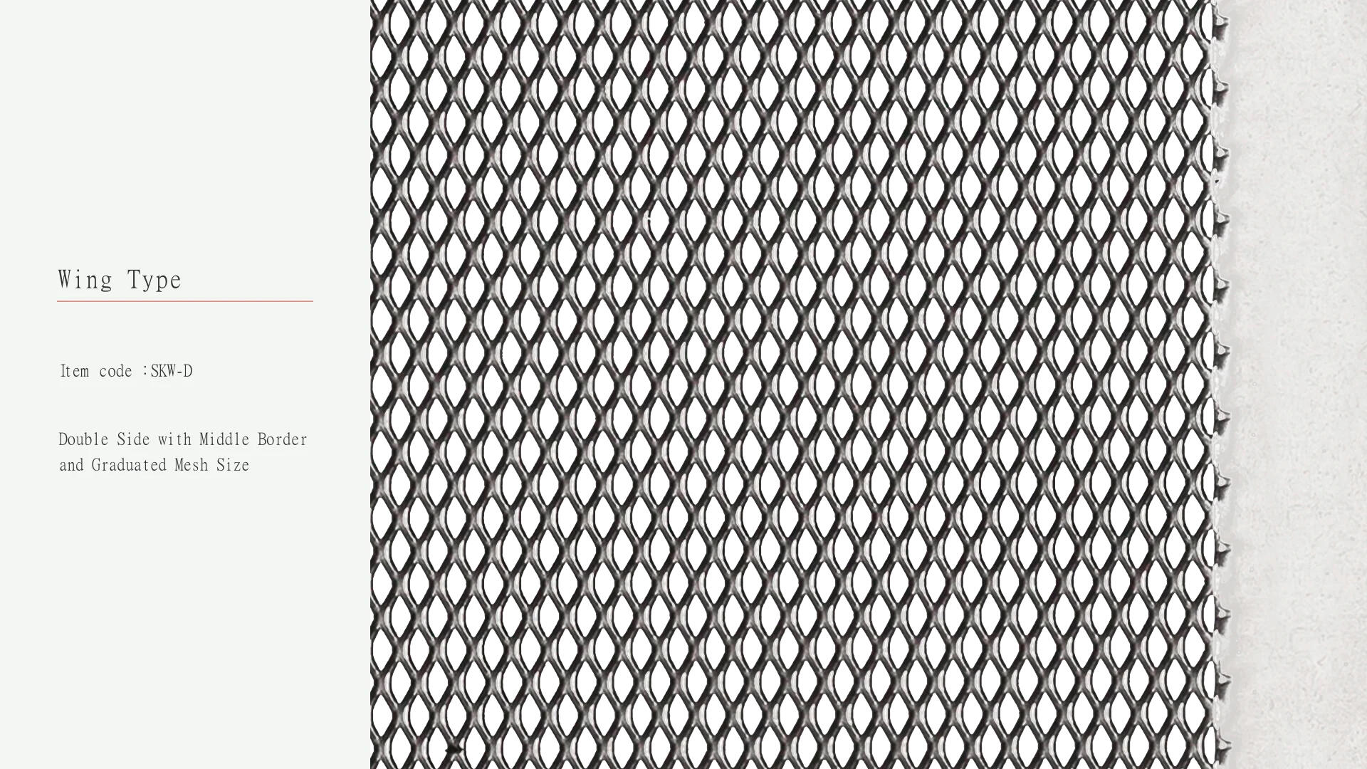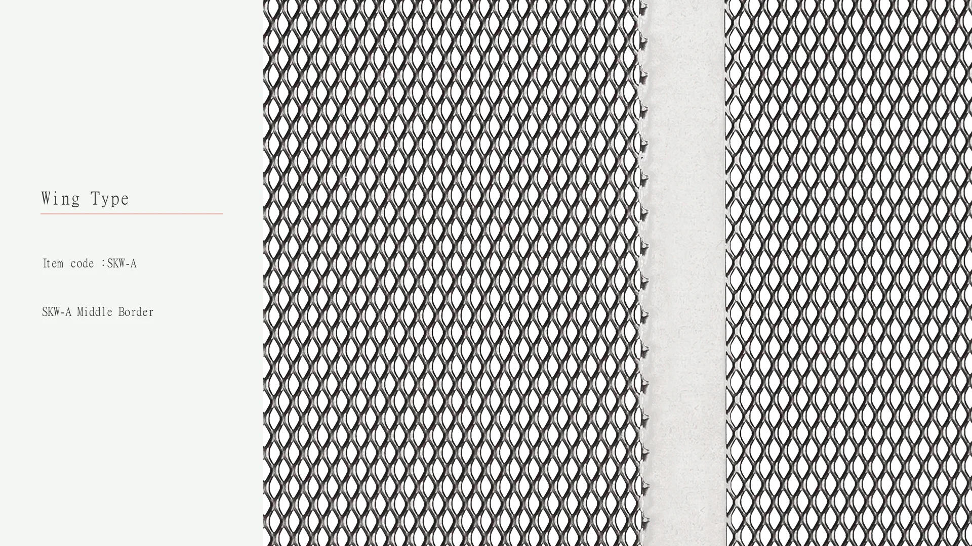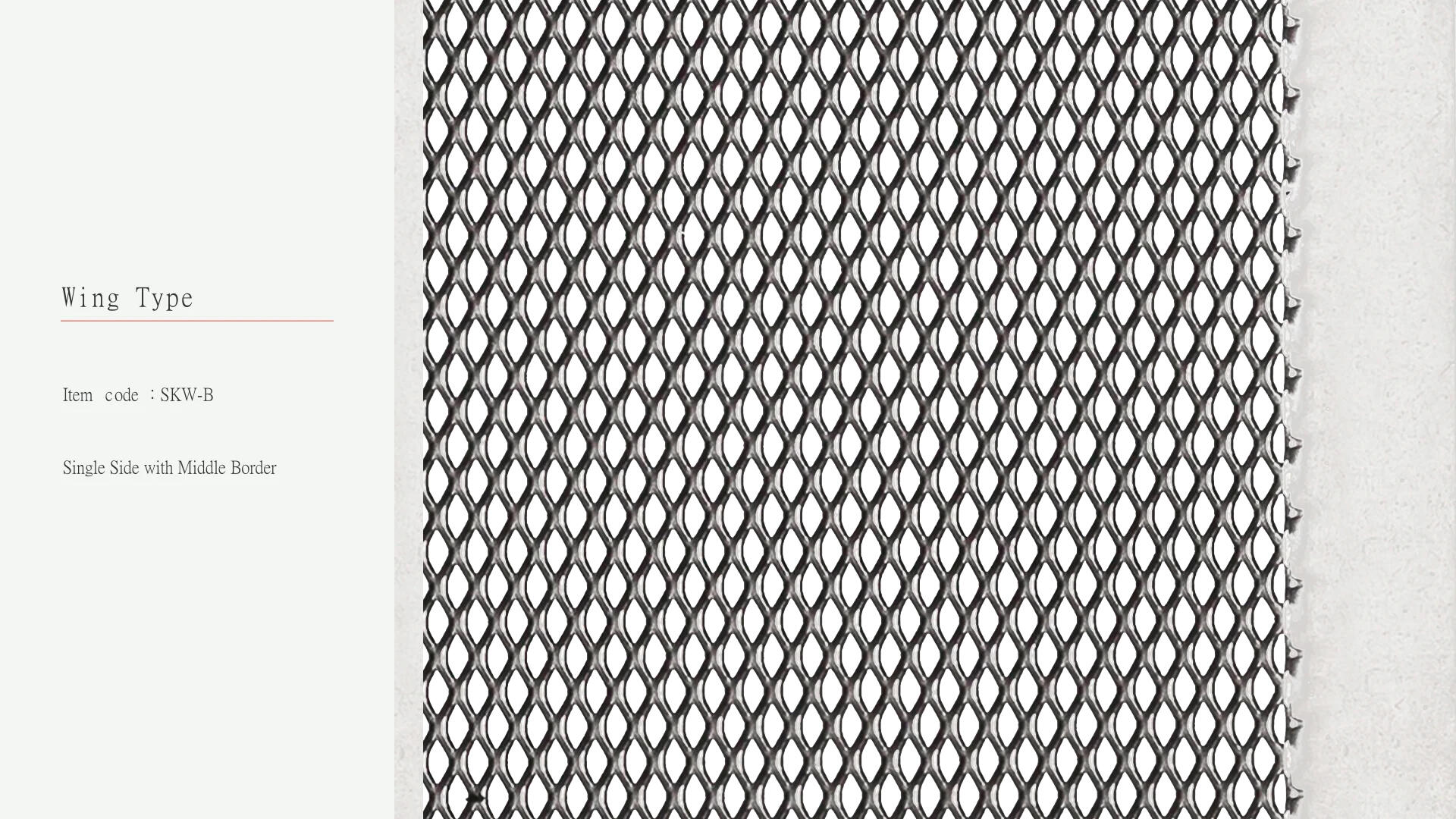 Wing Type is composed of metal sheets and mesh patterns, and the mesh size can be adjusted according to customer requirements. Customers can choose between designs with borders on both sides or with alternating spacing. Today, this type of mesh is widely used in industrial design products. For example, in furniture applications, the edge portion can be folded into a specific shape to increase the thickness of the joint surface, or it can be applied to the ion-active interface inside lithium batteries to generate electrical energy, thereby extending their life.