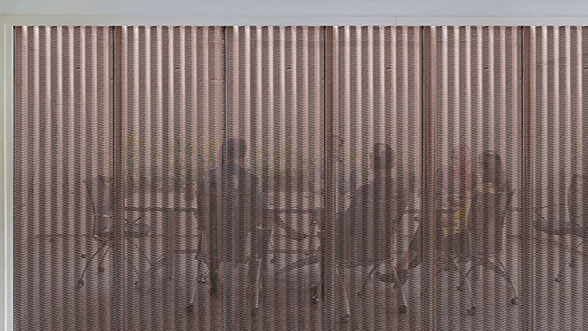 Through the mutual overlap of structure, color, and material. This design technique allows the expanded mesh to present various visual effects depending on the angle and lighting.
